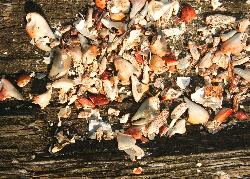 red streak and beaded with rain droplets.